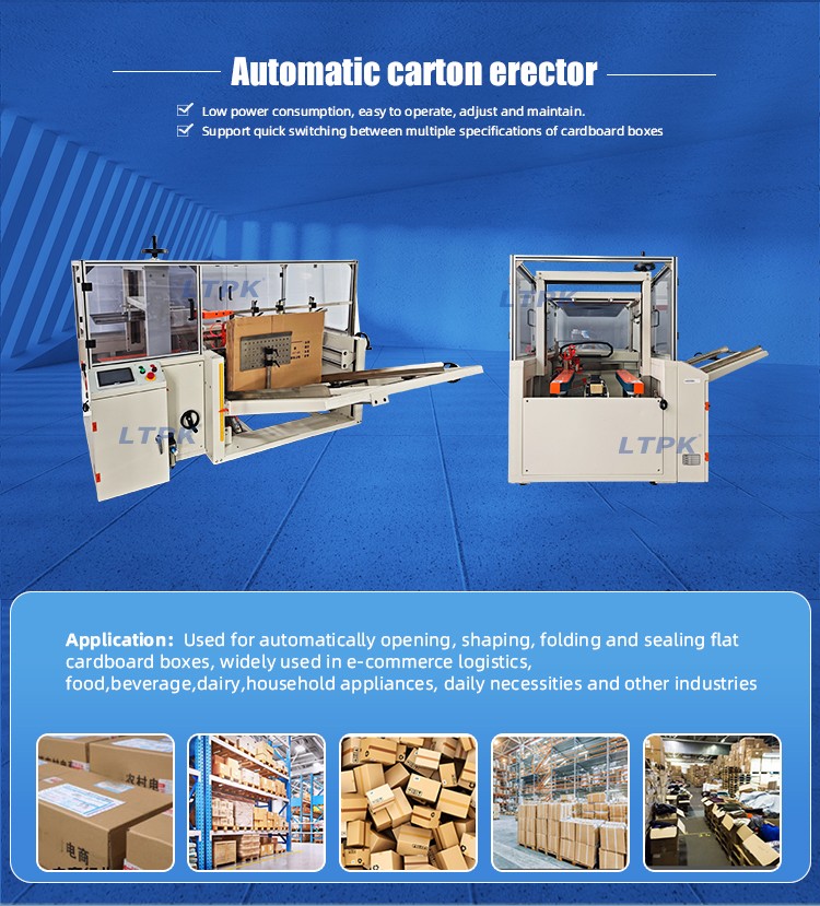 Used for automatically opening, shaping, folding and sealing flat cardboard boxes, widely used in e-commerce logistics, food,beverage,dairy,household appliances, daily necessities and other industries