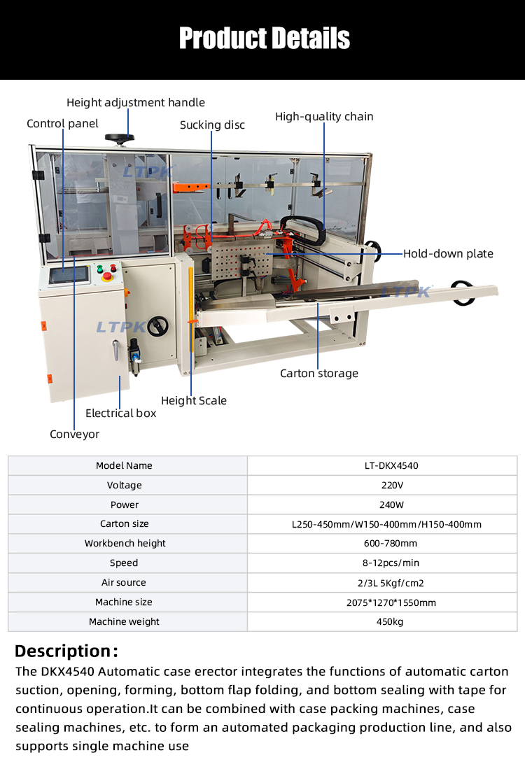 The DKX4540 Automatic case erector integrates the functions of automatic carton suction, opening, forming, bottom flap folding, and bottom sealing with tape for continuous operation.It can be combined with case packing machines, case sealing machines, etc. to form an automated packaging production line, and also supports single machine use