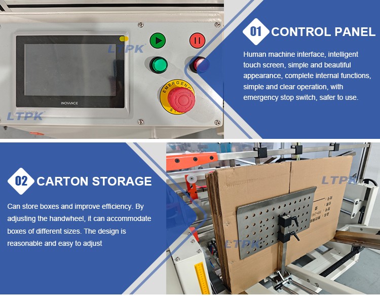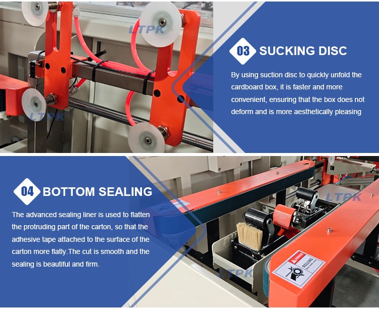 1. Full Automatic Operation: Automatically opens, shapes, folds and seals flat cardboard boxes in one process, reducing labor costs.