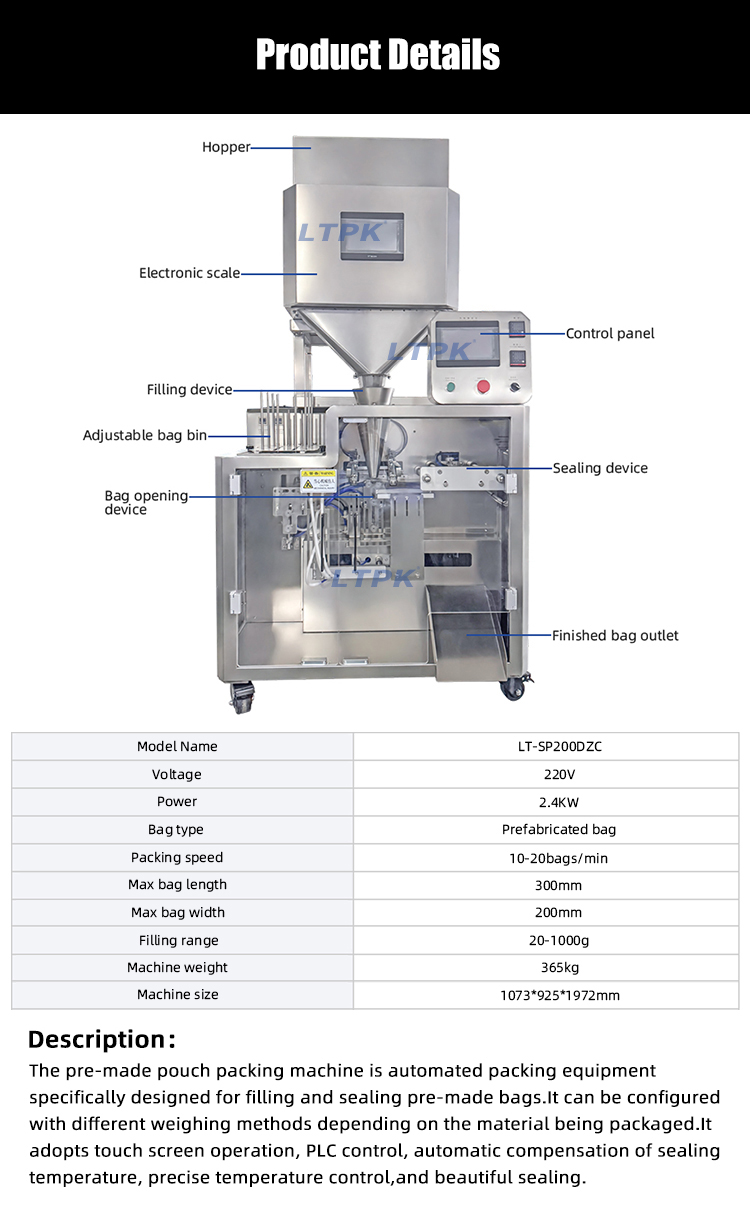 2. Premade Pouch Compatibility: Suitable for various pre-made bags (stand-up, zipper, flat pouches), with automatic bag feeding, opening, filling and sealing.